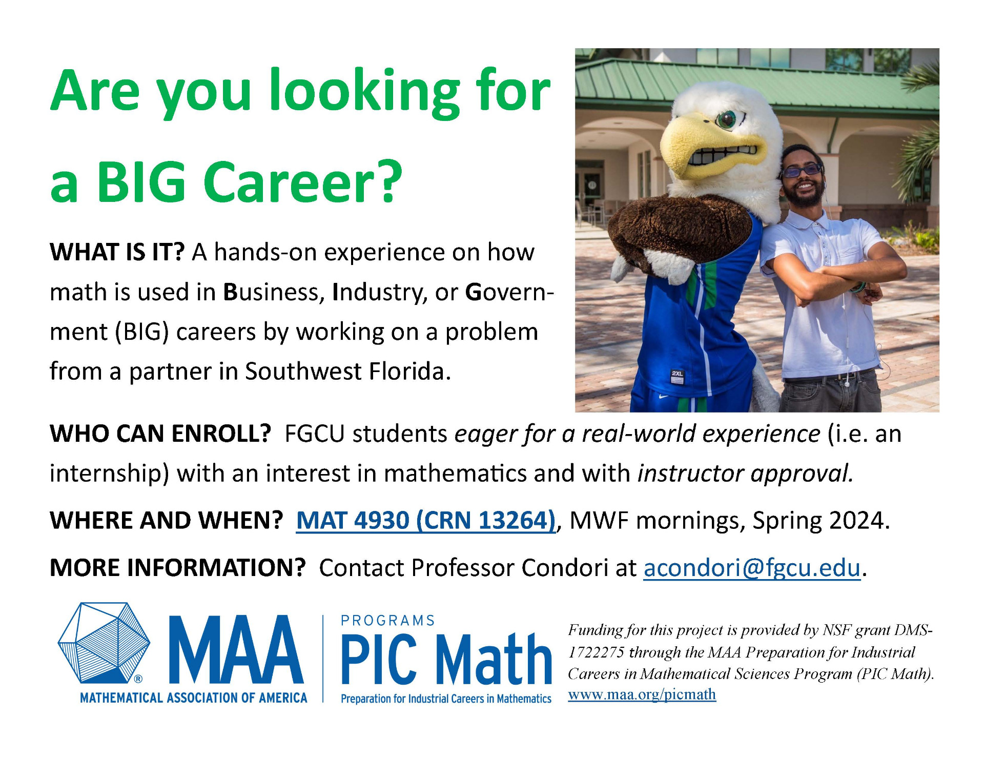 The main goal of the Industrial Mathematics course MAT 4930 is to mimic an internship in business, industry, and government in the classroom while working on a real-world problem from an industry partner from Southwest Florida. In fact, students document their interaction with a team in a professional setting, manage deadlines, think critically to find solutions to a real-world problem, write technical reports, and make a recommendation to the industry partner by delivering oral presentations. This scholarly activity fosters students' civic engagement and inquiry, intellectual breadth and depth, and development of critical thinking skills. If you did not hear about MAT 4930 before (Spring 2022), please see the FGCU 360 article from 2021 or the LinkedIn posting here.